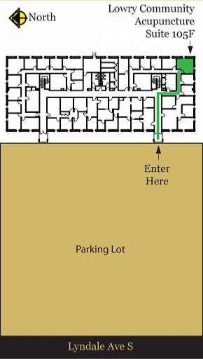 Conveniently located south of Davanni's on 86th and Lyndale in the Lyndale Office Building. Use the south entrance, go to end of the hall, and just before the steps, take a right into the 105 Suites. The clinic is in Suite 105F, which is the very southeast corner of the building. See floorplan image in the lower right below the Google Maps image.